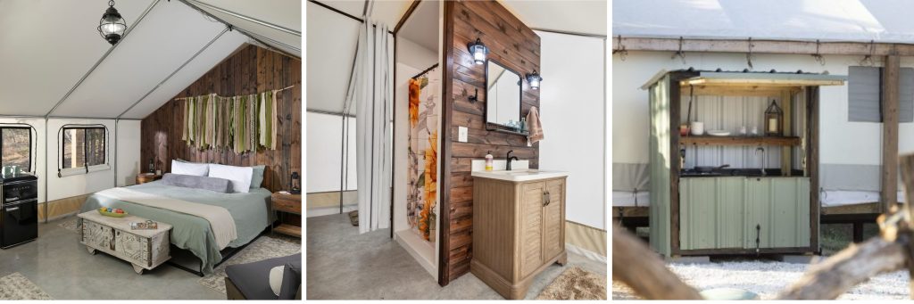 Luxury glamping in premium safari-tents: Each tent features king-size bedding, high-thread-count linens, a full in-suite bathroom, AC/heater, refrigerator, covered patio, a fully-stocked kitchenette, and charcoal grill.